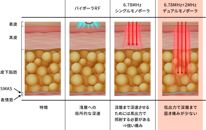 XERF(ザーフ)は6.78MHzに加え2MHzも搭載した世界で初めての「デュアル周波数モノポーラRF」です。たるみ治療では、6.78MHzのモノポーラRFが主流ですが、2MHzを合わせることで深層脂肪層まで熱エネルギーを届ることができ、リフティングとタイトニング効果が期待できます。