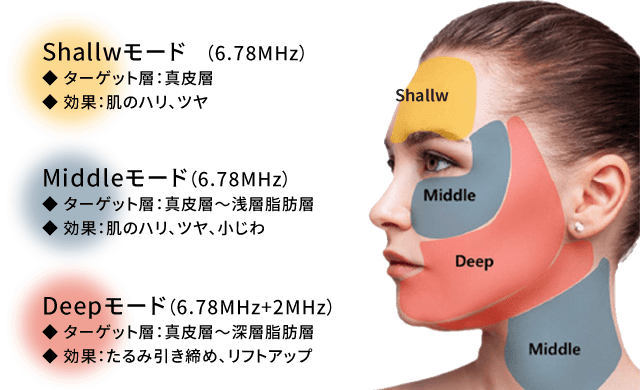 お顔にはボリュームがある部位、皮膚が薄い部位、たるんでいる部位などがあり、人それぞれ違います。XERFは『Shallo』『Middle』『Deep』の3つの熱エネルギーの深度が調整できるため、ひとり一人のお顔に合わせたカスタマイズ治療ができます。